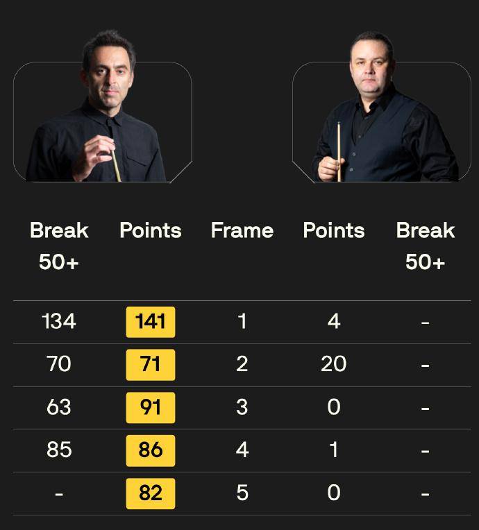 第三局,博伊科的进攻稍微好了一些,但奥沙利文还是稳扎稳打,慢慢积累分数,最终以74比50拿下,总比分来到3-0。第四局,奥沙利文的进攻状态继续上升,他又打出了一杆112分,以123比54轻松取胜,总比分4-0,还拿到了4个赛点。